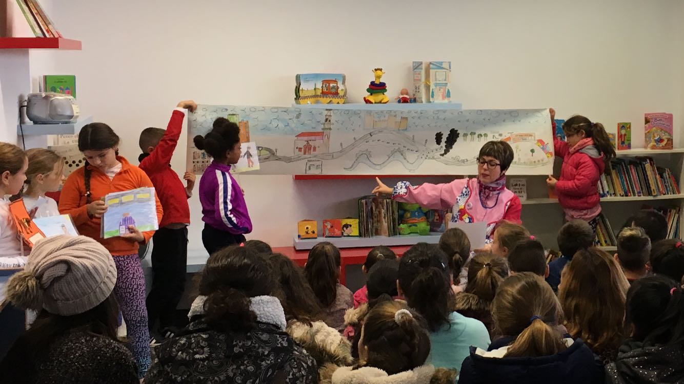 En 3º los alumnos y alumnas trabajaron las partes del cuento, sus personajes y las "paradas" en lugares de Alcalá del protagonista, para después hacer una búsqueda en internet de esos lugares y plasmarlos en un gran mural, a través del cual iba desarrollándose toda la historia de foma visual.